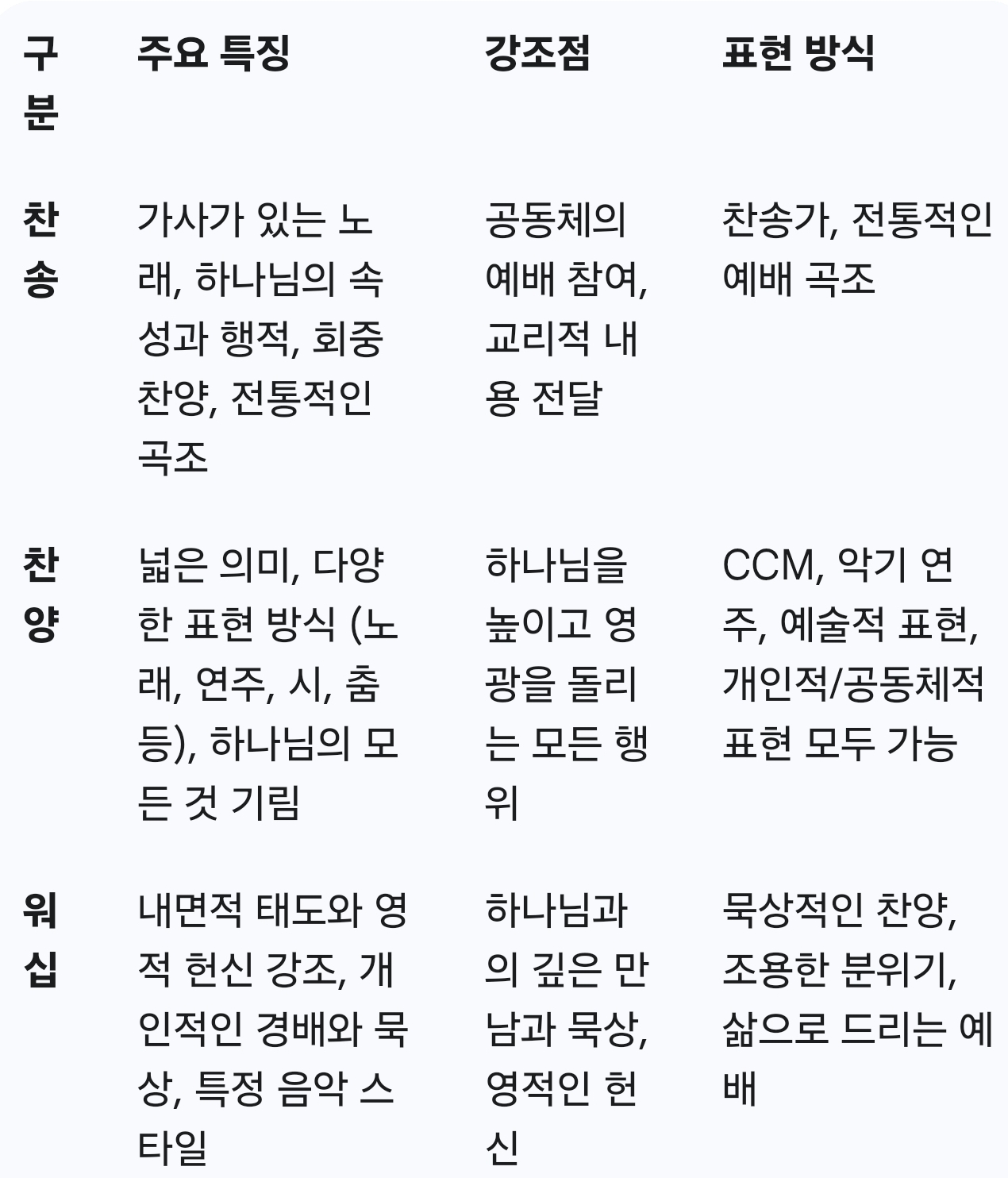 • 넓은 의미로 사용되어, 노래뿐만 아니라 악기 연주, 시, 간증, 춤, 예술 등 다양한 방식으로 하나님을 높이는 행위를 포함할 수 있습니다.