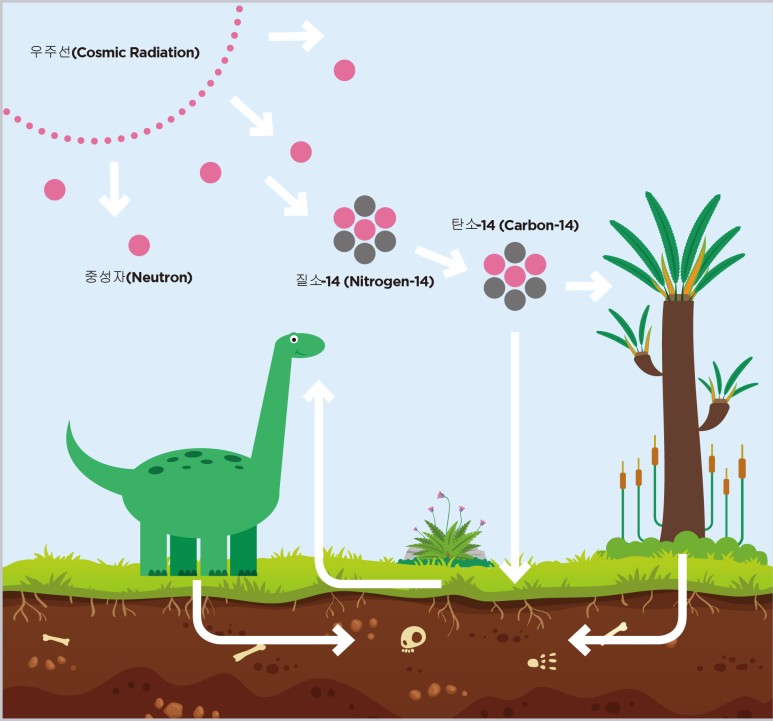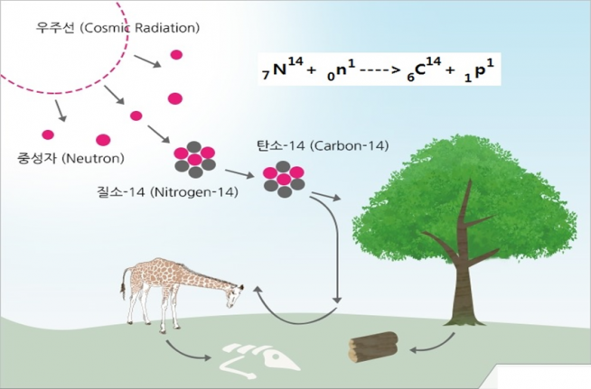 탄소-14는 방사성 동위원소로, 우주 방사선에 의해 대기 중에서 생성되어 지구 대기와 생명체에 존재합니다. 탄소-14는 반감기가 약 5,730년으로, 생명체가 죽으면 더 이상 새로운 탄소-14가 생성되지 않기 때문에, 유기물의 탄소-14의 양은 시간이 지남에 따라 감소합니다.