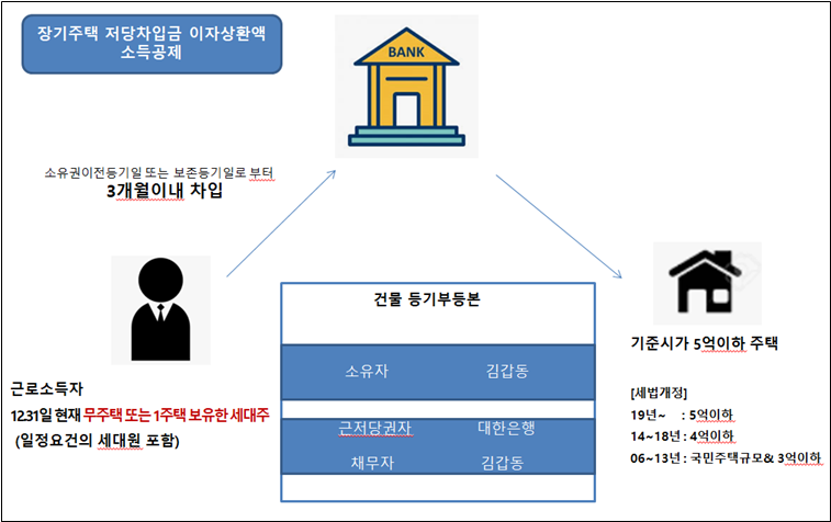 • 취득 당시 기준시가 5억원 이하인 주택을 취득하기 위하여 그 주택에 저당권을 설정하고 금융기관으로부터 장기 저당대출을 받은 경우